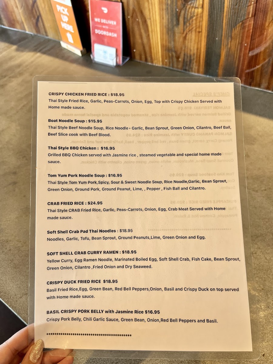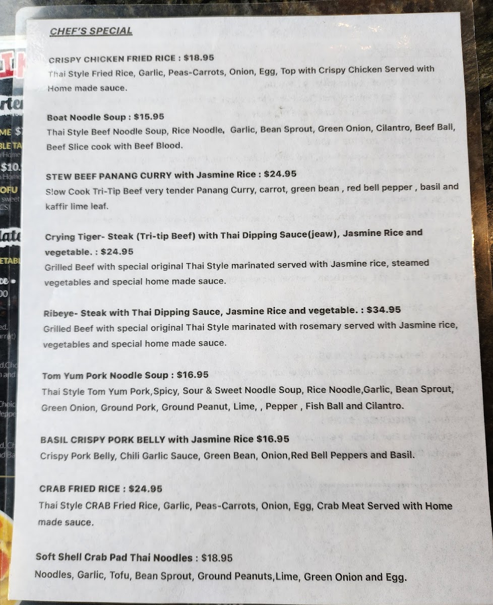 If you're in the mood for some street food, their selection includes the Pad Kee Mao (Drunken Noodle), Boat Noodle Soup, Basil Chopped Chicken with Rice, and Crispy Chicken Fried Rice, all of which bring vibrant, bold flavors to your dining experience.